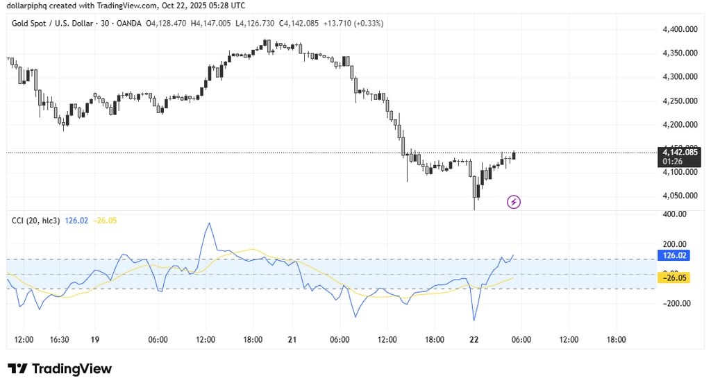 The CCI measures how far the price deviates from its average level. Values above +100 suggest strong bullish momentum. Values below -100 suggest strong bearish momentum.