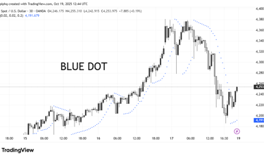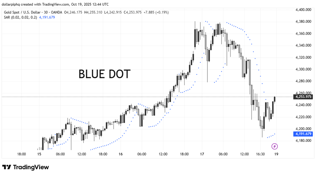 Dots above the price = downtrend / sell signal