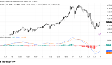 The MACD shows the relationship between two moving averages to detect trend momentum.